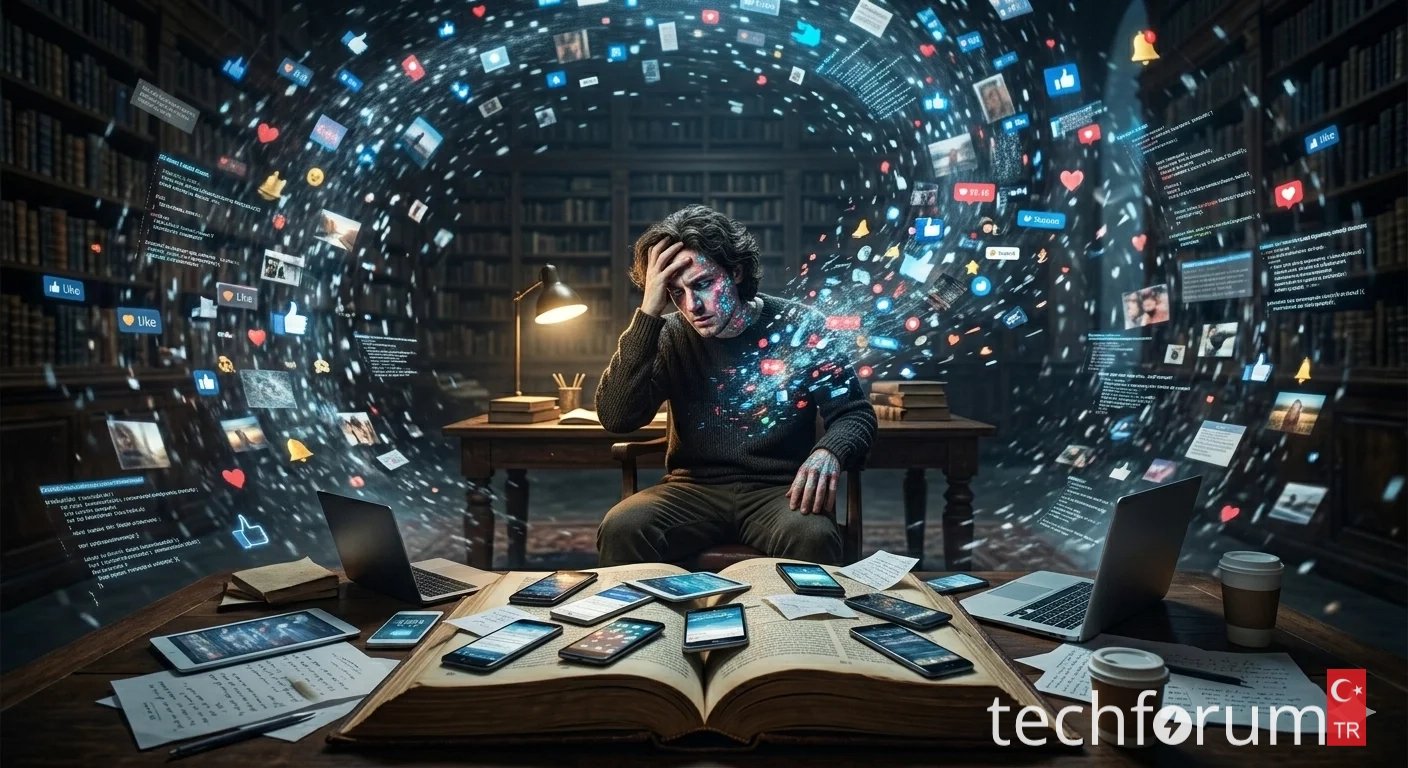 Modern insanın zihni, her gün maruz kaldığı devasa veri bombardımanı altında eziliyor. Sabah uyandığın andan itibaren bildirimler, haber başlıkları, kısa videolar ve sosyal medya paylaşımları zihnine hücum ediyor. Bu durum, "bilgi obezitesi" dediğimiz fenomeni tetikliyor. Tıpkı vücudun ihtiyacından fazla kaloriyi yakamayıp yağa dönüştürmesi gibi, beynimiz de bu kontrolsüz veri akışını işleyemiyor. Bir konuyu derinlemesine öğrenmek yerine, o konunun sadece "başlığını" bilmekle yetiniyoruz. Derinlemesine bir analiz okumak yerine, 15 saniyelik bir özet videosunu izleyip konuya hakim olduğumuzu sanıyoruz. Bu sığlaşma, eleştirel düşünme yetimizi ve odaklanma kaslarımızı köreltiyor. Bizler artık okumuyoruz, sadece "taramalı" bir şekilde piksellerin üzerinde geziniyoruz.