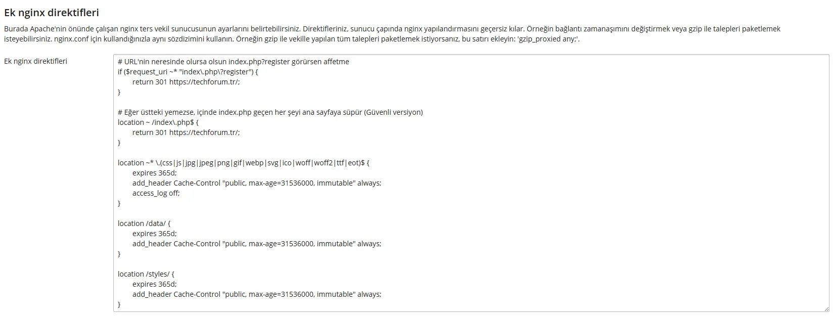 Plesk panelinizde "Apache ve Nginx Ayarları" kısmına girin. Sayfanın en altındaki "Ek Nginx direktifleri" kutusuna gelin ve şu sihirli dokunuşu yapın: