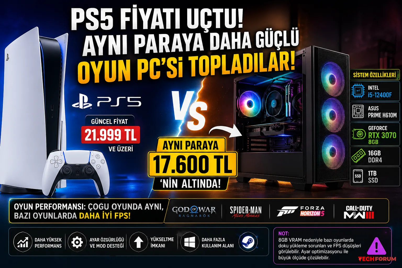 PS5 fiyatları artınca dengeler değişti! Sadece 17.600 TL’ye RTX 3070’li oyun bilgisayarı toplandı. Performans karşılaştırması ve detaylar burada. PS5 Artık Mantıklı mı? Fiyatlar Tartışma Yarattı Sony’nin PlayStation 5 için yaptığı zamlar sonrası konsol piyasasında dengeler ciddi şekilde değişti. Bir zamanlar “fiyat/performans kralı” olarak görülen PS5, artık oyun bilgisayarı karşısında eski avantajını kaybetmiş gibi duruyor. Bazı teknoloji içerik üreticilerine göre bu fiyat artışı: Ya ileride yapılacak büyük indirimler için zemin hazırlama Ya da PS6 öncesi kullanıcı tepkisini ölçme stratejisi Aynı Fiyata Oyun PC’si Topladılar! Bir içerik üreticisi, PS5 fiyatına denk bir bütçeyle sistem toplamayı denedi ve sonuçlar dikkat çekici oldu. Kurulan sistem: İşlemci: Intel Core i5-12400F Anakart: ASUS Prime H610M Ekran Kartı: GeForce RTX 3070 RAM: 16 GB DDR4 Depolama: 1 TB SSD Toplam maliyet: 17.600 TL Performans: Konsoldan Daha mı Güçlü? Yapılan testlerde bu sistem: Çoğu oyunda PS5 ile aynı. Bazı senaryolarda daha yüksek FPS DLSS sayesinde daha stabil performans sunmayı başardı. Ancak tamamen kusursuz değil: 8 GB VRAM bazı oyunlarda limit oluşturabiliyor Doku yükleme sorunları görülebiliyor Ama bu sorunlar ayar optimizasyonu ile büyük ölçüde çözülebiliyor. Konsol mu PC mi? Bu karşılaştırma şunu net gösteriyor: Artık “konsol daha ucuz” devri bitiyor Orta seviye bir PC, aynı paraya daha esnek ve güçlü olabilir Ama unutma: Konsol = tak çalıştır rahatlık PC = performans + yükseltilebilirlik Seçim tamamen kullanım tarzına bağlı. Sık Sorulan Sorular PS5 mi daha güçlü RTX 3070 mi? RTX 3070 çoğu senaryoda daha yüksek performans sunar, özellikle DLSS destekli oyunlarda. 17.600 TL’ye gerçekten oyun PC’si toplanır mı? Evet, özellikle ikinci el GPU kullanılırsa bu bütçede güçlü sistem kurulabilir. Konsol mu PC mi daha mantıklı? Rahatlık istiyorsan konsol, performans ve esneklik istiyorsan PC. PS5 fiyatları neden arttı? Kur, üretim maliyetleri ve Sony’nin fiyat politikası etkili. Bu sistem geleceğe ne kadar dayanır? Orta-üst seviye olarak 2-3 yıl rahat götürür, sonra upgrade gerekebilir. İkinci el güvenilir parçalardan yapılmış.