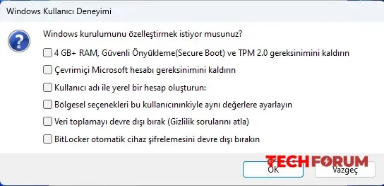 -Şimdi en önemli kısım: " 4 GB+ RAM, Güvenli Önyükleme ve TPM 2.0 gereksinimini kaldır " seçeneğini işaretleyin. Ayrıca, zorunlu BitLocker'ı kapatmak, yerel bir hesap oluşturmak gibi ek seçenekleri de seçebilirsiniz.
