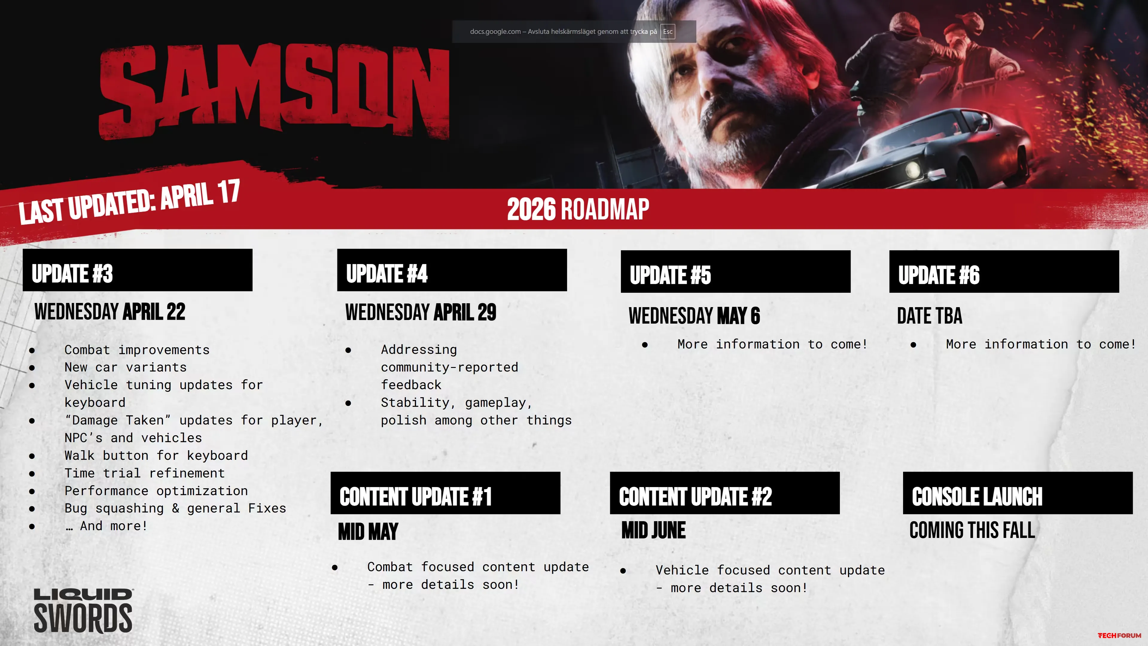 Liquid Swords Studio, Samson'ın yakın gelecekteki geliştirme planlarını açıkladı. Beklentileri karşılamayan bir lansmanın ardından, ekip oyunu aktif olarak geliştirmeye devam ediyor ve oyuncu geri bildirimlerine dayanarak bir dizi güncelleme hazırlıyor.